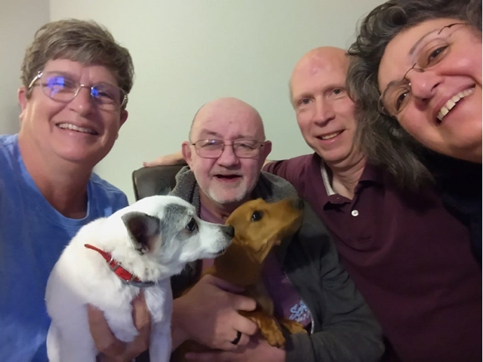 In November 2021, we visited Kristen’s and Curtis’ house. (Her husband is also named Curtis!) Banu is being eyed by their canines.