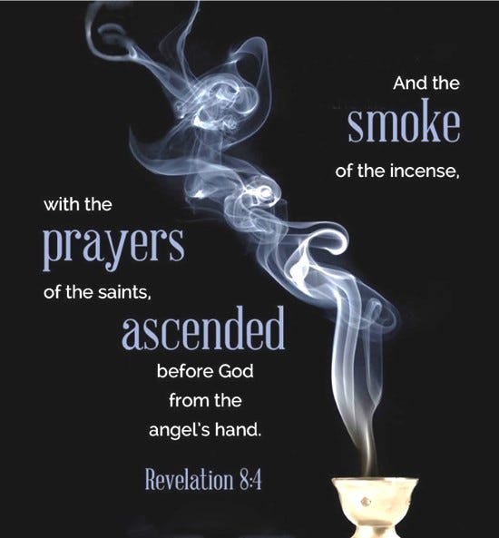Revelation 8:4 “And the smoke of the incense, with the prayers of the saints, rose before God from the hand of the angel.”